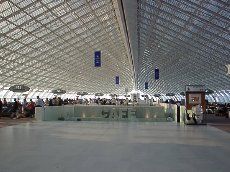 | シャルルドゴール空港の搭乗ゲートです。太陽光を取り入れたとても明るい雰囲気です。この明るさで19時半頃です。20時5分発のエールフランスでジュネーブに出発する予定でしたが、ここで何かトラブルが発生し、何時に離陸できるかわからない・・・ということになりました。結局1時間ほど待たされただけで済みましたが、日本時間では真夜中の日本人は、みんなぐったりとソファーに座っていました。 |