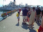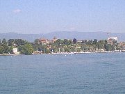 | 私たちが乗った船は、あちこちの小さな船着き場に止まりながら、ローザンヌまで行くようでした。とりあえず、電車で帰れるところで下りようと決めて、船を楽しみました。レマン湖沿いには、お城のような別荘らしい家がたくさん建っていました。どのおうちも素敵でした。写真左の様に、ボートに乗って上半身はだかになり、つりを楽しむ人々や、湖で泳ぎを楽しむ人々がたくさんいました。思い思いに夏の一日を楽しんでいるようでした。 |