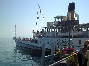 | お昼ご飯はジュネーブで食べようと思っていたので、そろそろ船を下りることにしました。ニヨンという街で下船することに決めました。写真右は船のエンジンらしきもの(?)です。すごい力で動いていました。 |