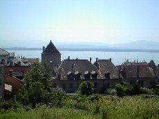 | ニヨンの古城壁散歩道から見たニヨンの街とレマン湖です。茶色の屋根の街並みと、レマン湖の水色がとてもきれいな眺めでした。 |