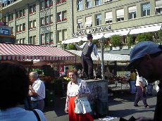 | 左上は牢獄塔です。小さい入り口を入っていくと、すぐに階段があって上ることができます。左下の写真は、かなり上までいったところから写したものです。牢獄塔の前は広場になっていて、野菜や果物の市が出ていました。右上のチャップリンの銅像は実は本物の人間です。何でこんな所に銅像があるのかなぁと思っていると、前に置いた箱にお金を入れた人がいました。すると、今までじっと動かなかった銅像が動き出しました!とっても上手な動きでした。 |
