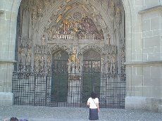 | 大聖堂です。正面入り口の彫刻です。左半分は神に選ばれた人々、右半分は地獄に落ちていく人々を表しているそうです。とても細かい彫刻で見飽きませんでした。左下の写真は小さくてよく見えませんが、上から落ちそうになっている怖い顔をした生き物です。 |