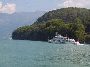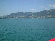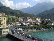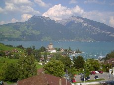 | 左上はシュピーツの船着き場です。鉄道の駅まで歩いていこうとしましたが、ちょっと遠いのではと思ってバスに乗りました。スイスパスで乗ることが出来ました。 鉄道の乗換駅だとばかり思っていましたが、湖と山と街並みが本当にきれいなところでした。電車の時間まで、景色を楽しみました。 |