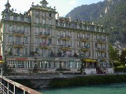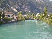 | シュピーツからは電車で、インターラーケンヴェスト駅に向かいました。今日からのホテルはアーレ河沿いのセントラルコンチネンタルです。古い造りのホテルですが、ベランダに小さなテーブルと椅子があり、こんなきれいな風景を見ることができました。アーレ河がとても涼しげでした。 | |