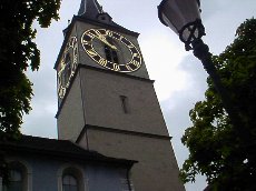 | バーンホフ通りを歩きました。大通りから、いくつもの小道がでていますが、どこもとても趣のあるかわいらしい通りです。左上は3年前の新婚旅行の時に、何も知らずに偶然歩いた道だ!と気付いてとても嬉しくなりました。右上は聖ペーター教会です。道が入り組んでいて、たどり着くのが大変でした。左下はフラウミュンスターです。 |