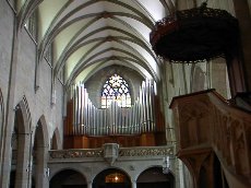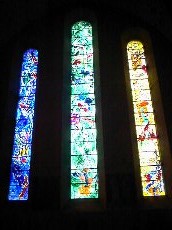 | フラウミュンスターの中です。左上がシャガールの描いたステンドグラスです。それぞれの色が素晴らしいステンドグラスで、しばらく見とれていました。 |