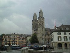 | グロースミュンスターです。右上はジャコメッティが作ったステンドグラスです。左下は地下聖堂にあったカール大帝です。この像がある地下聖堂は11〜12世紀のものだそうです。シーンと静まり返っていました。 |