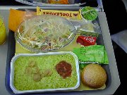 | 楽しかった旅行も終わりです。チューリッヒ14時発のJL454便で成田に帰りました。スイスエアとのシェア便ということで、初めてスイスエアで長時間の空の旅をすることになりました。右は機内食です。リゾットはチーズの味が結構こくて、やっぱりスイスだなぁと思いました。生野菜のサラダは機内食でこんなにたくさんの野菜を食べたのは初めてで、とてもおいしかったです。成田には定刻より少し早い8時半ごろに無事到着しました。いろいろな乗り物に乗って、ハイキングもいっぱいして、楽しい旅行でした。 |