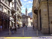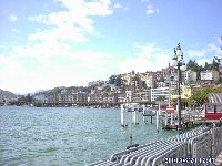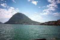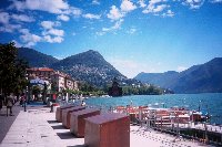 | 左の写真はルガノ駅です。少しクリーム色っぽい色合いが、イタリアっぽい雰囲気を表しています。駅の外に出ると、黄色い帽子をかぶった背の高い男の人たちが、何か配っています。そこには「ファンタ・レモン」の宣伝マンたちがたくさんいました。私も150ミリリットルの缶を2本もらいました。 駅は小高い丘の上にあります。道を渡って湖側を見ると、山々と湖の風景が広がっています。 |