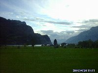 | ブリューニック線は、スイスでも車窓からの風景が美しいところと言われているそうです。進行方向右側の方が景色がよく見えます。 ルツェルンを出たときは、ものすごい雷雨でした。あまりに強い雨でちょっと先も見えない程でした。でもしばらくすると、雲が切れてこんなきれいな風景が見えてきました。湖や山々を、ずっと眺めていました。 |