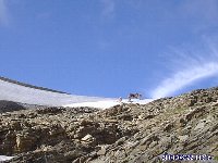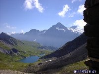 バッハアルプゼーから先、どこへ行くか迷いました。いろいろなコースを考えて、ファウルホルンへ登ってみようかということにしました。 1時間半ほどのコースですが、標高2681メートルの頂上まではかなりの坂道が続いているのが見えます。ちょっとくじけそうになりながらも、あの曲がり道まで、次はあの小屋までと目標を決めて頑張りました。上から見る湖はまた違った風景でそれもきれいでした。右上の写真は、わかりにくいですが氷の上を歩いている牛の集団です。滑らないかしらと心配になりました。 |