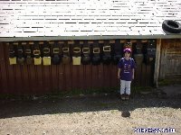 | コースの途中に、カウベルをたくさんぶら下げた小屋がありました。放牧している牛のための小屋の様でした。ちょっと近付いて写真を撮ってみました。ベルが私の顔よりも大きくて、こんなに大きな物を首から下げて重たくないのかしら?と思いました。 |