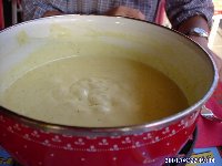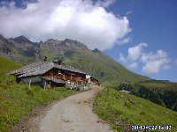 | 最後の急な坂道を登って、ちょうど1時間半くらいかけてファウルホルンに到着しました。ここは山の頂上にレストランがあります。今まで登ってきた道がず〜っと見渡せるとても眺めがいい場所にテーブルが並んでいました。標高が高いだけあって、太陽が雲に隠れると急に寒くなります。 12時だったので、お昼ご飯にしようと思いました。メニューを見るとずっと食べたいと思っていた「ケーゼシュニッテ」があります。これはパンの上にチーズを乗せてオーブンで熱したスイス風のチーズトーストです。固くなったパンなどをおいしく、また量をふやして食べる知恵だったのかなぁと思いました。このレストランの物は、名前に「ファウルホルン風」と付いているだけあって、本などで見た物とはちょっと雰囲気が違ってグラタン風でもありましたが、体が温まって本当においしかったです。飲み物はすっかり大好きになった「コールドチョコレート」。冷たいミルクにちゃんと溶けて、疲れが飛んでいくようなおいしい甘さでした。 |