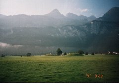 | 9月23日 今日はツェルマットに向けて出発です。いいお天気の中、まずは草原の中をバスで進みます。バスの中はヨーデルのテープが流れていました。あんまり気持ちがいいので、運転手さんにテープを見せて頂いたら、おみやげやさんで売っているよ、とのことでした。ツェルマットで買うことができ、家でもスイス気分を味わうことができます。 |