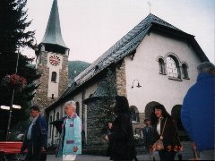 | バーンホフ通りにある教会です。近くにはマーモットの泉というかわいい像がありました。このメインストリートはベランダに花をかざったかわいらしいホテルやお店が並び、何度往復しても楽しめました。 |